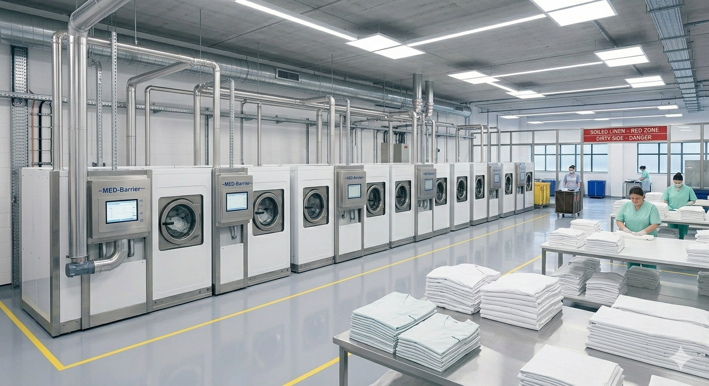 Healthcare laundry systems designed around hygiene control, workflow discipline, and operational continuity.